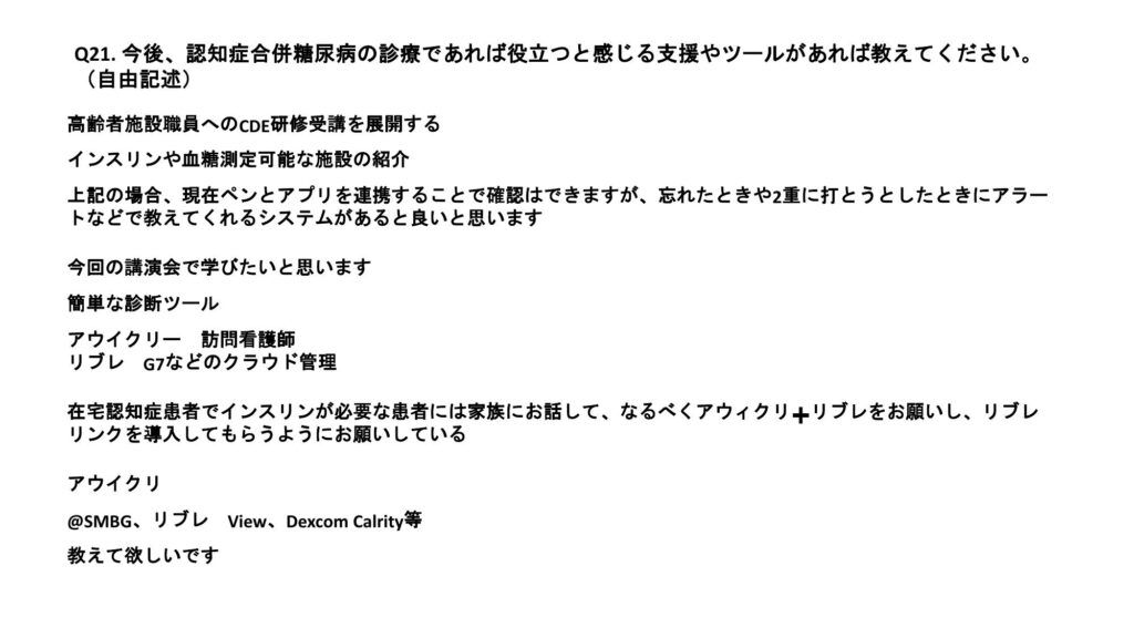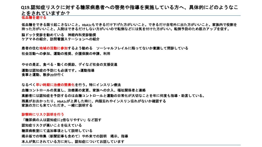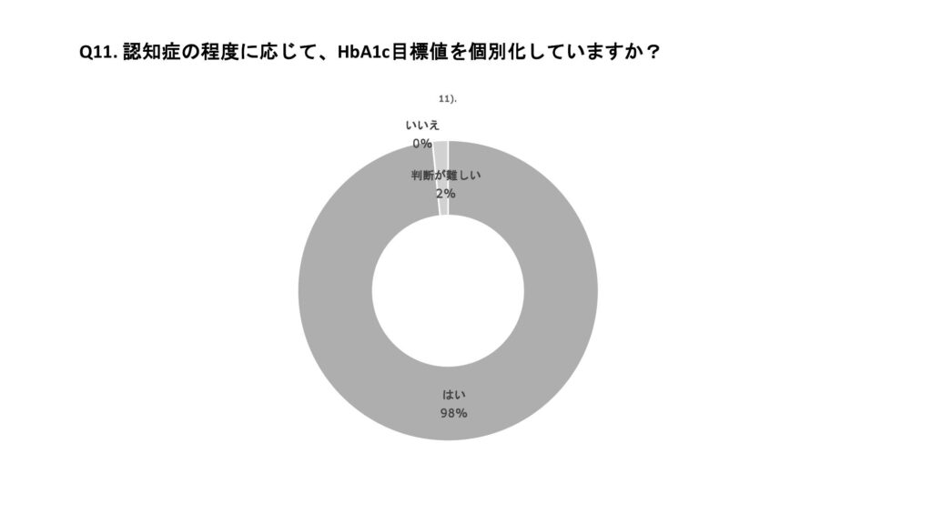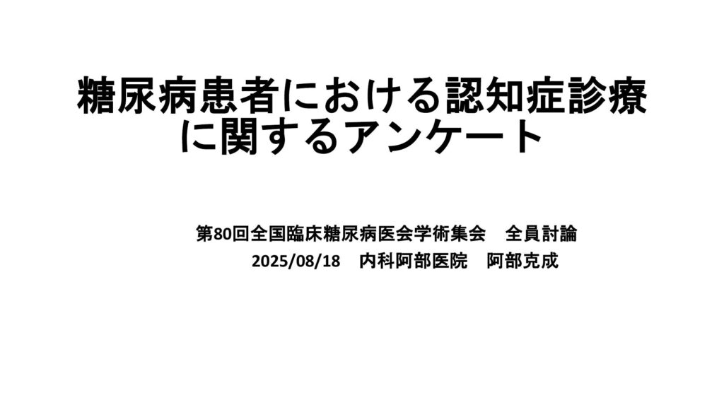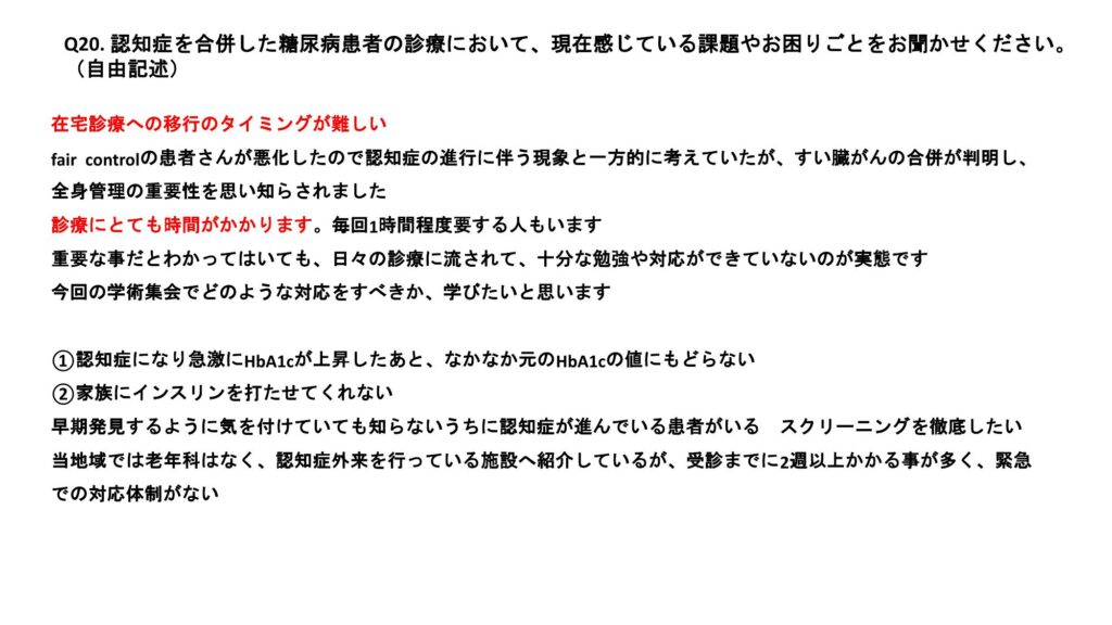 今回、全員討論のテーマとして「糖尿病患者における認知症診療に関するアンケート」を行った。その結果を発表する。