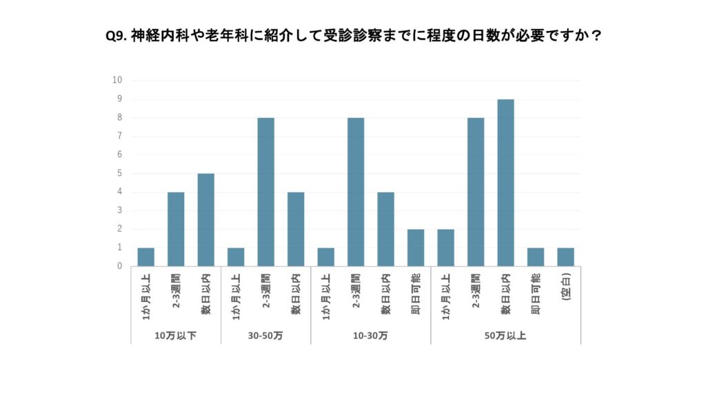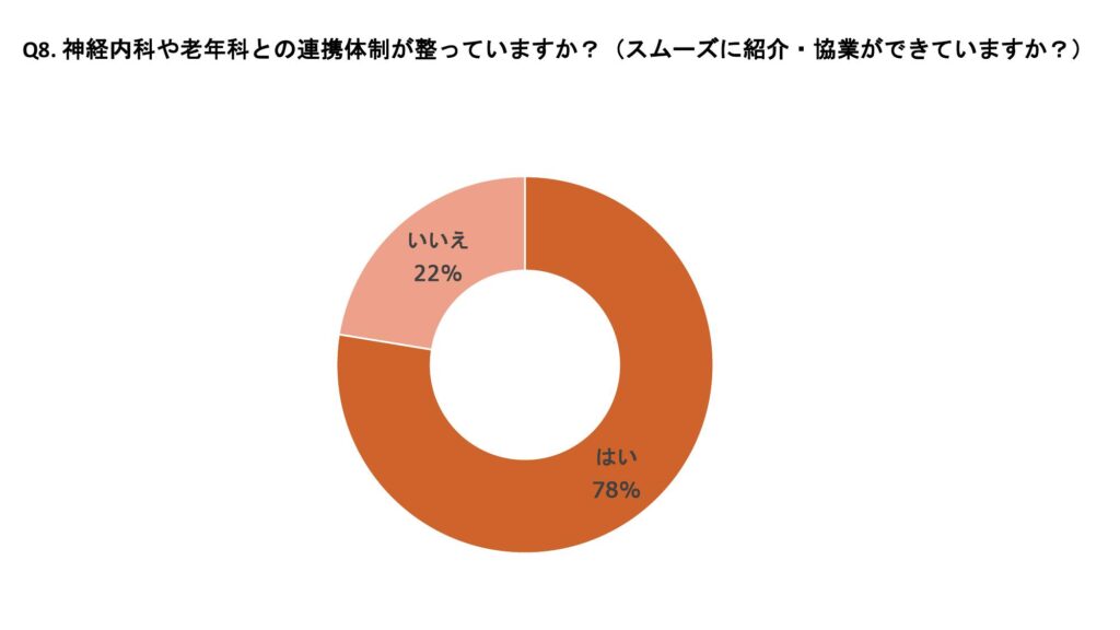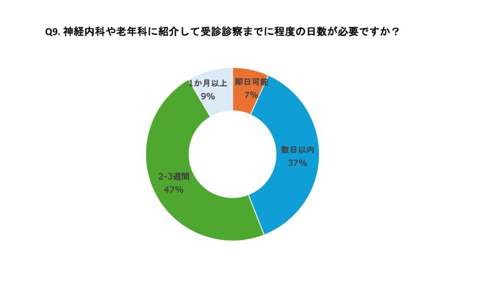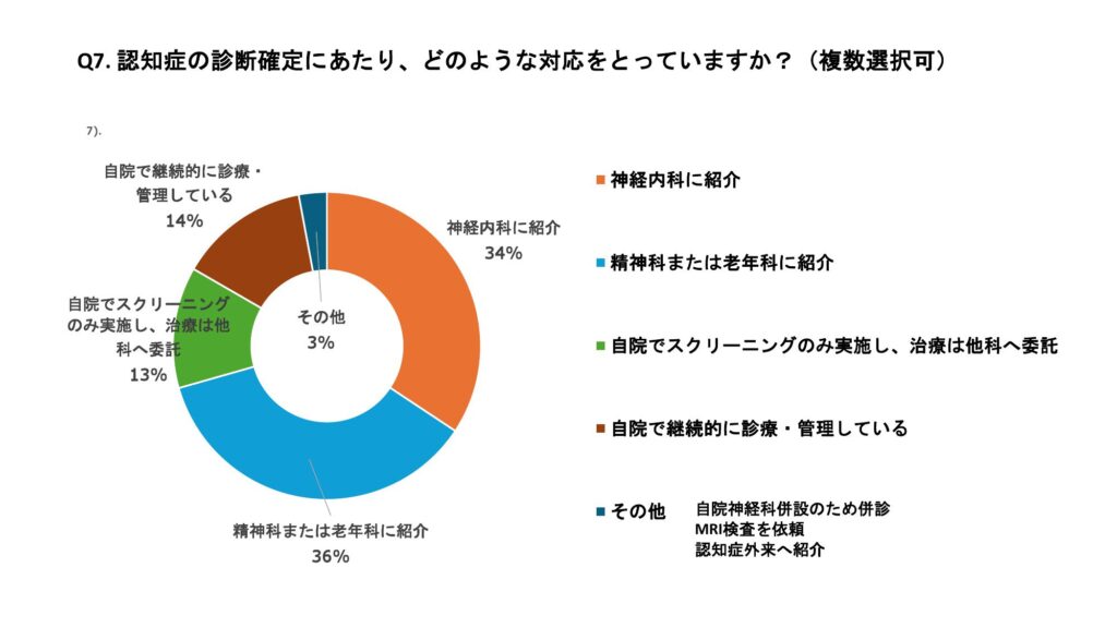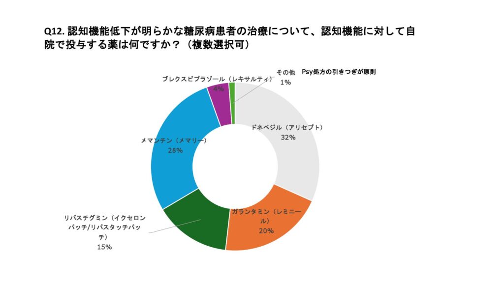 認知症の確定診断に際し、神経内科、精神科、老年科へ紹介している施設は70%、自院で診療管理している施設は14%であった。診療体制については78%の施設が神経内科、老年科との診療体制が整っていると回答した。また、紹介から受診までの日数は、「数日以内」が37%、「2~3週程度」が47%、「即日対応」が7%であった。 認知機能低下が明かとなった患者に対しては、98%の施設がHbA1cの目標値を個別化しており、多くの施設でインスリンや経口薬の簡素化や減量、中止などの対応を行っていた。認知機能低下に対して自院で処方している薬剤はドネペジル(アリセプト)32%、ガランタミン(レミニール)20%、 メマンチン(メマリー)28%の順に多く使用されていた。