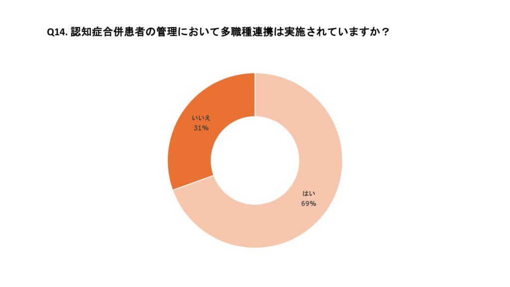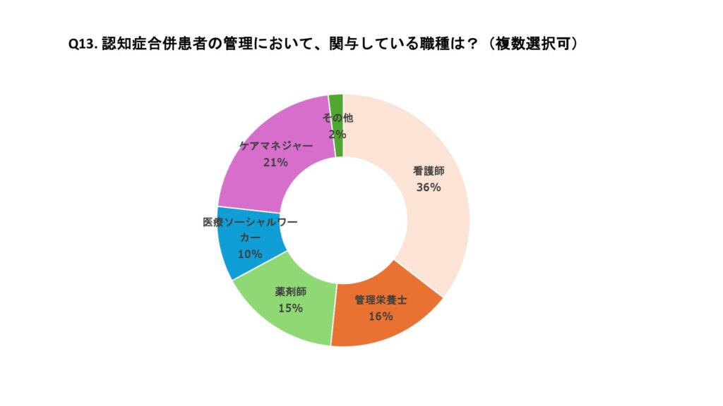 認知症合併患者の管理において主に関与している職種は、看護師が36%と最も多く、次いでケアマネージャー21%、管理栄養士16%、薬剤師15%であった。また、多職種連携を実施している施設は69%であった。