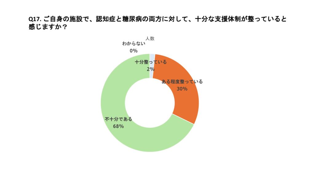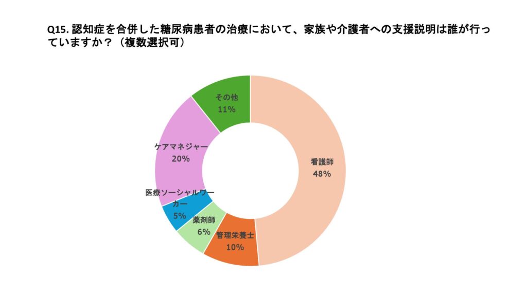 認知症患者の家族や介護者への支援説明をしている職種は、看護師が48%、ケアマネージャーが20%、管理栄養士が10%であった。支援説明については患者の変化がない場合は年1回程度、変化のある場合はその都度家族に連絡し、同伴のうえ直接説明しているケースが多かった。 自施設において認知症と糖尿病治療に対する支援体制として「十分整っている」と答えた施設は2%、「ある程度整っている」とした施設は30%、「不十分」と答えた施設は68%であった。認知症リスクに対する糖尿病患者への啓発や指導を実施している施設は47%であった